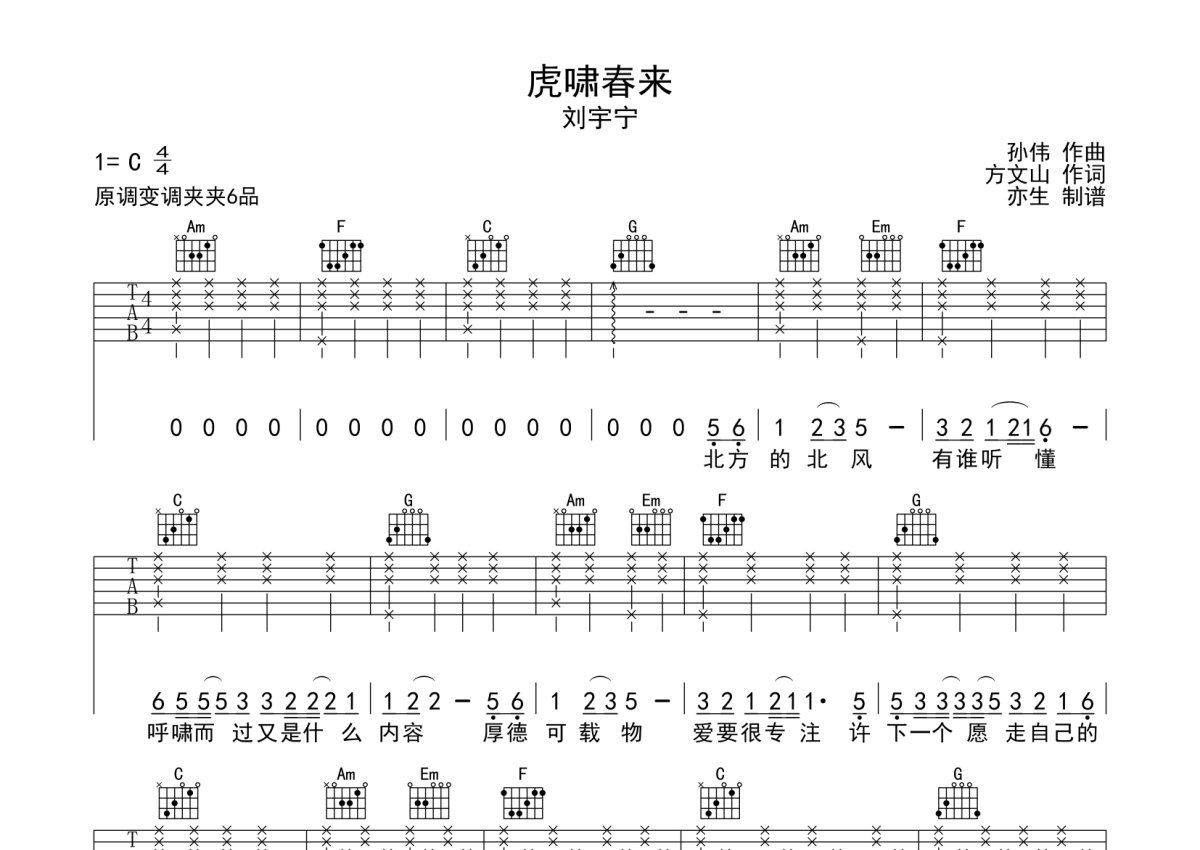 刘宇宁《虎啸春来》吉他谱 - C调弹唱六线谱