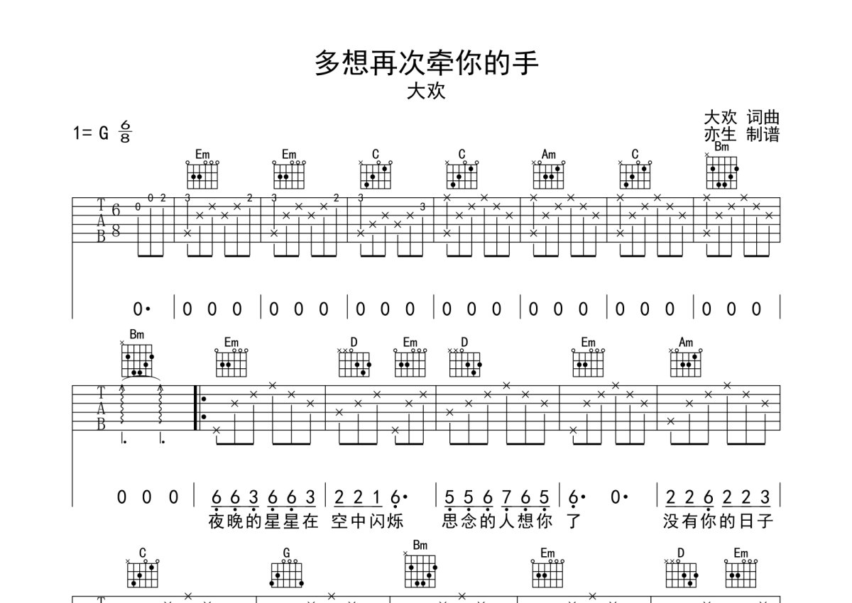 大欢《多想再次牵你的手》吉他谱 - G调弹唱六线谱