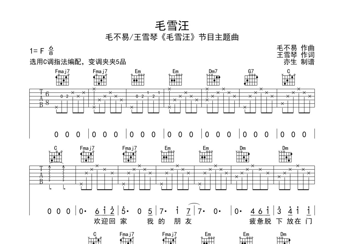 毛不易《毛雪汪》吉他谱 - C调弹唱六线谱