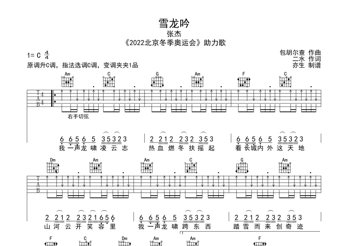 张杰《雪龙吟》吉他谱 - C调弹唱六线谱