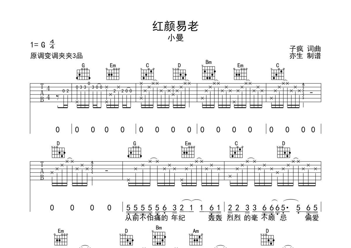 小曼《红颜易老》吉他谱 - G调弹唱六线谱