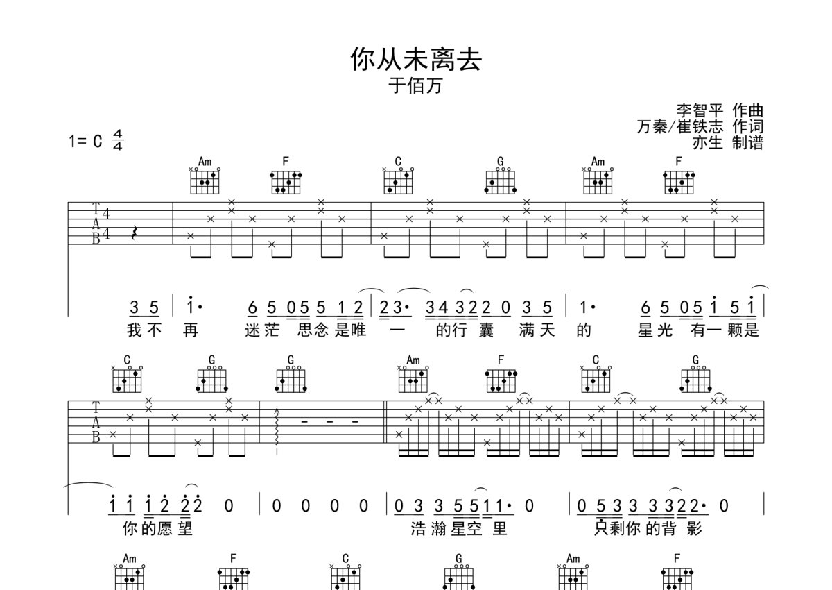 于佰万《你从未离去》吉他谱 - C调弹唱六线谱 - 完整版