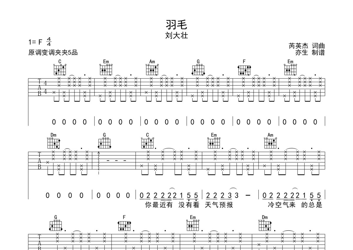 刘大壮《羽毛》吉他谱 - C调弹唱六线谱