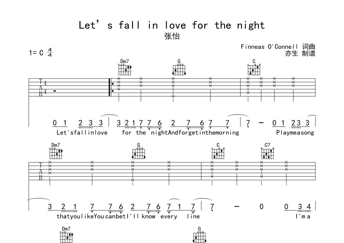 张怡《Let‘s fall in love for the night》吉他谱 - C调弹唱六线谱