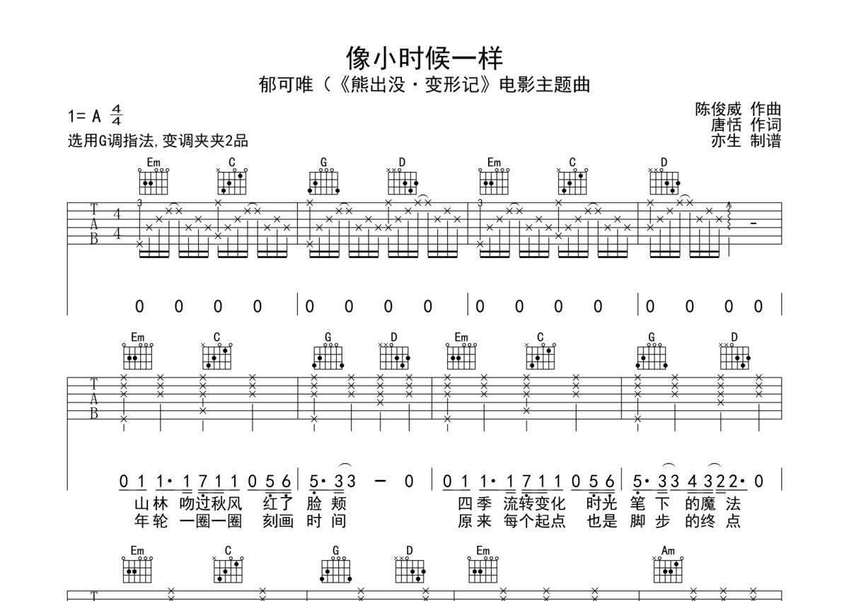 郁可唯《像小时候一样》吉他谱 - G调弹唱六线谱