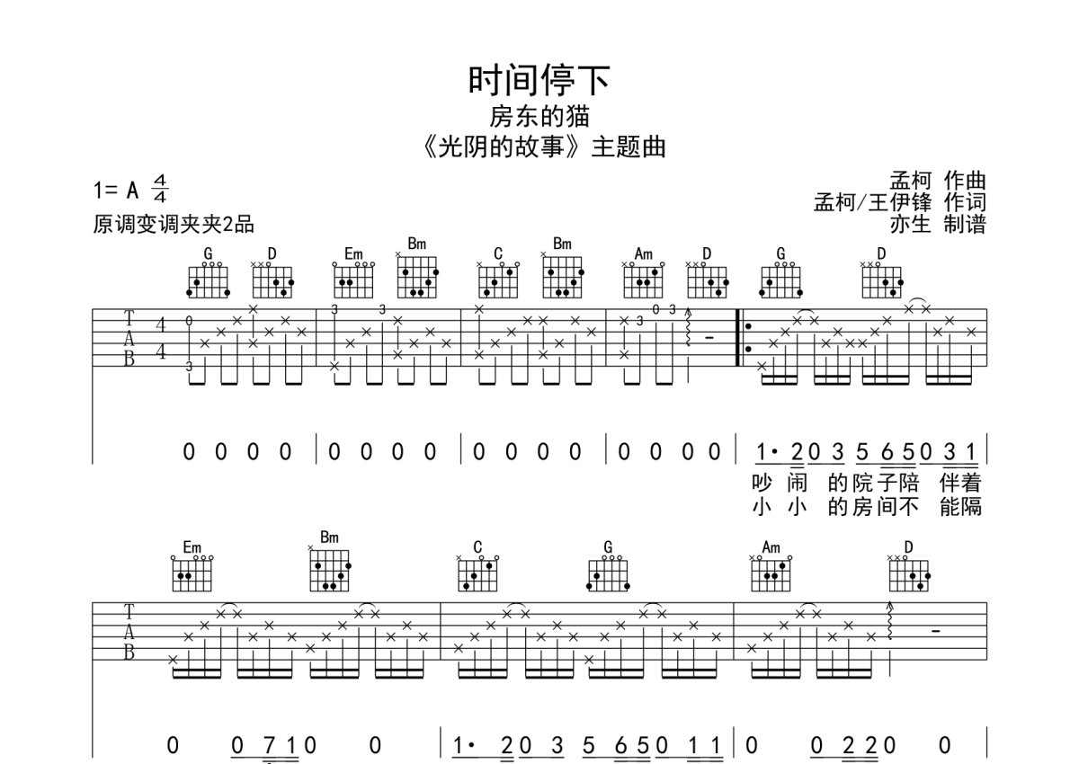房东的猫《时间停下》吉他谱 - G调弹唱六线谱