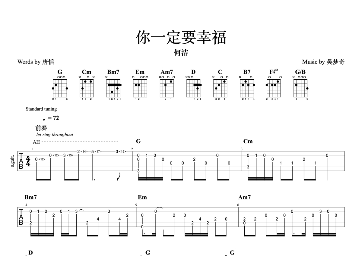 何洁《你一定要幸福》吉他谱 - G调独奏六线谱 - 完整编配版