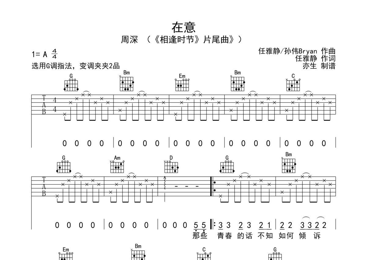 周深《在意》吉他谱 - G调弹唱六线谱