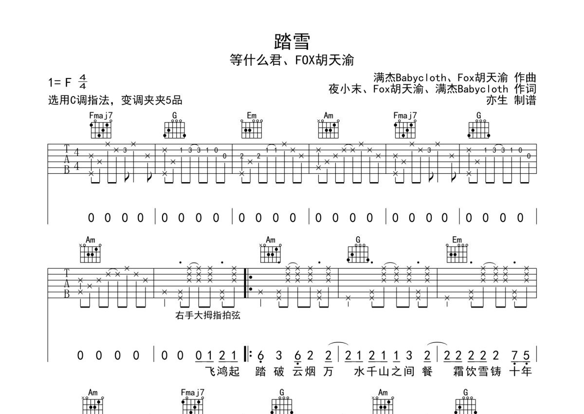 等什么君《踏雪》吉他谱 - C调弹唱六线谱
