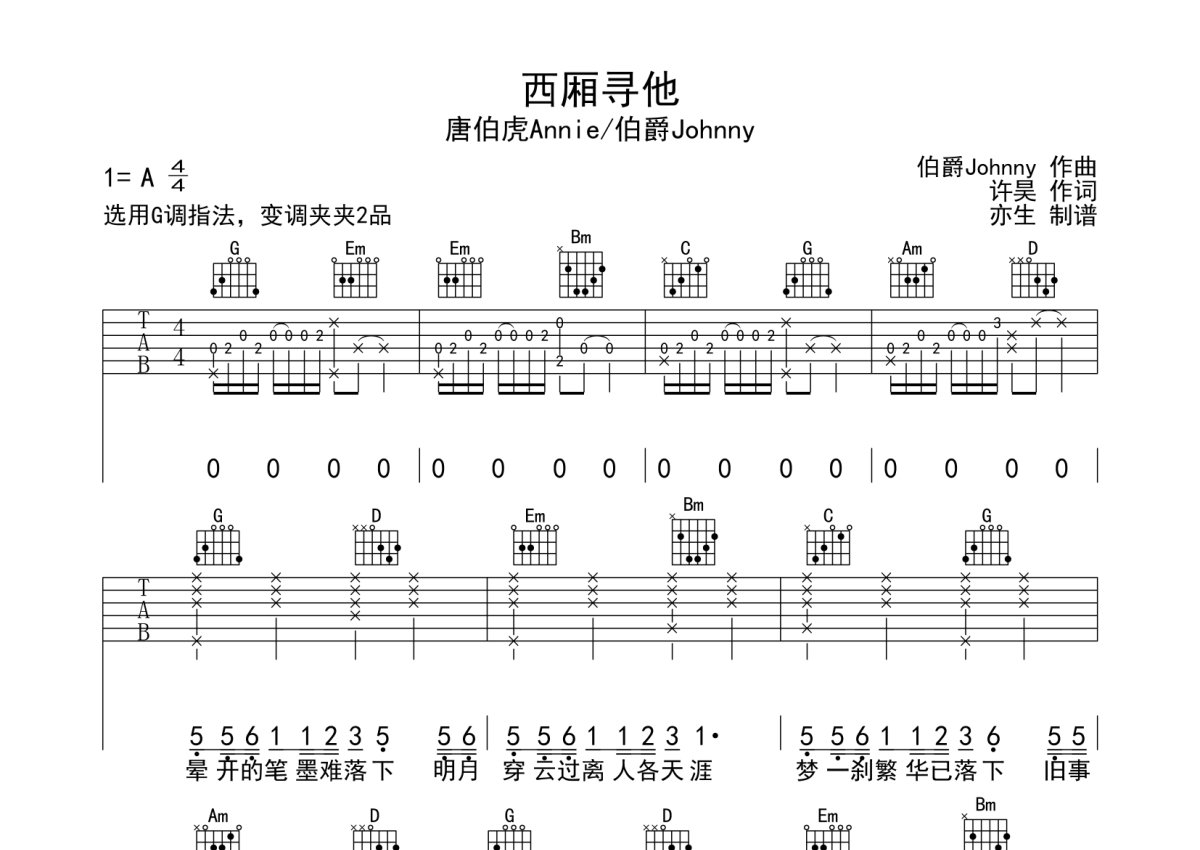 唐伯虎Annie《西厢寻他》吉他谱 - G调弹唱六线谱