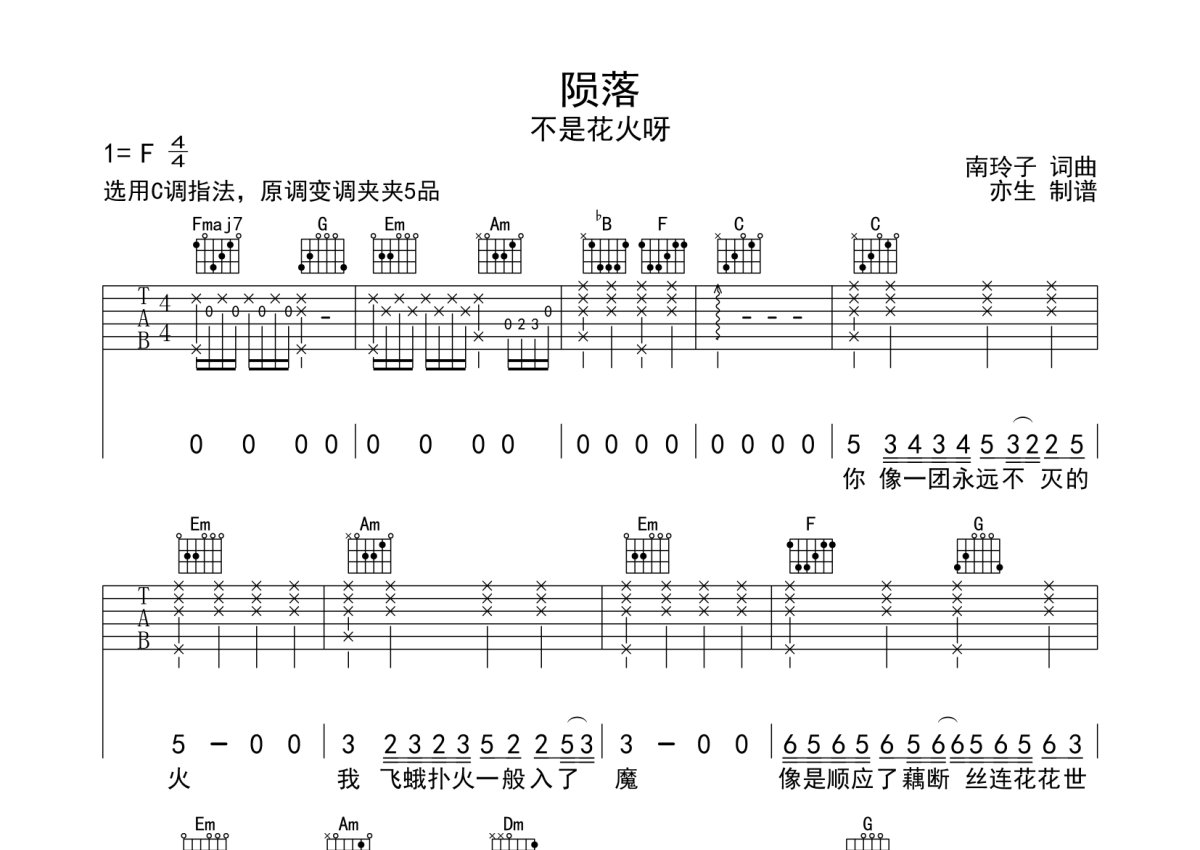 不是花火呀《陨落》吉他谱 - C调弹唱六线谱