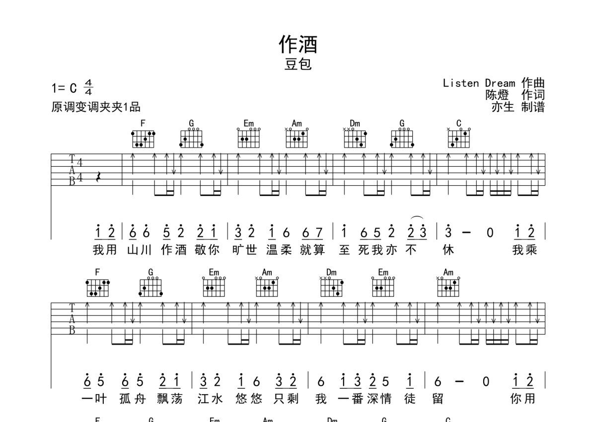 豆包《作酒》吉他谱 - C调弹唱六线谱 - 扫弦版