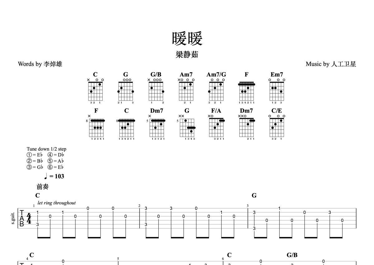 《暖暖》是梁静茹演唱的一首歌曲,完整编配版,本吉他谱采用的是C调指法编配,这份吉他谱共有五张高清图谱,图谱由 @一颗加菲 编配上传,图谱使用六线谱编配,曲谱配备了相关的音频提供试听,使用这份暖暖吉他谱,可以让你更加方便地掌握这首歌曲的演奏技巧,快来尝试吧。