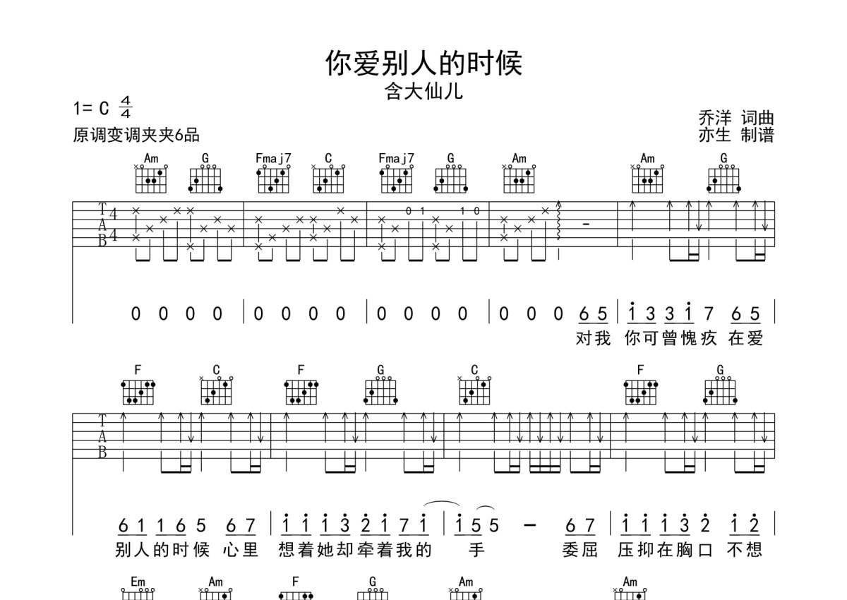 含大仙儿《你爱别人的时候》吉他谱 - C调弹唱六线谱