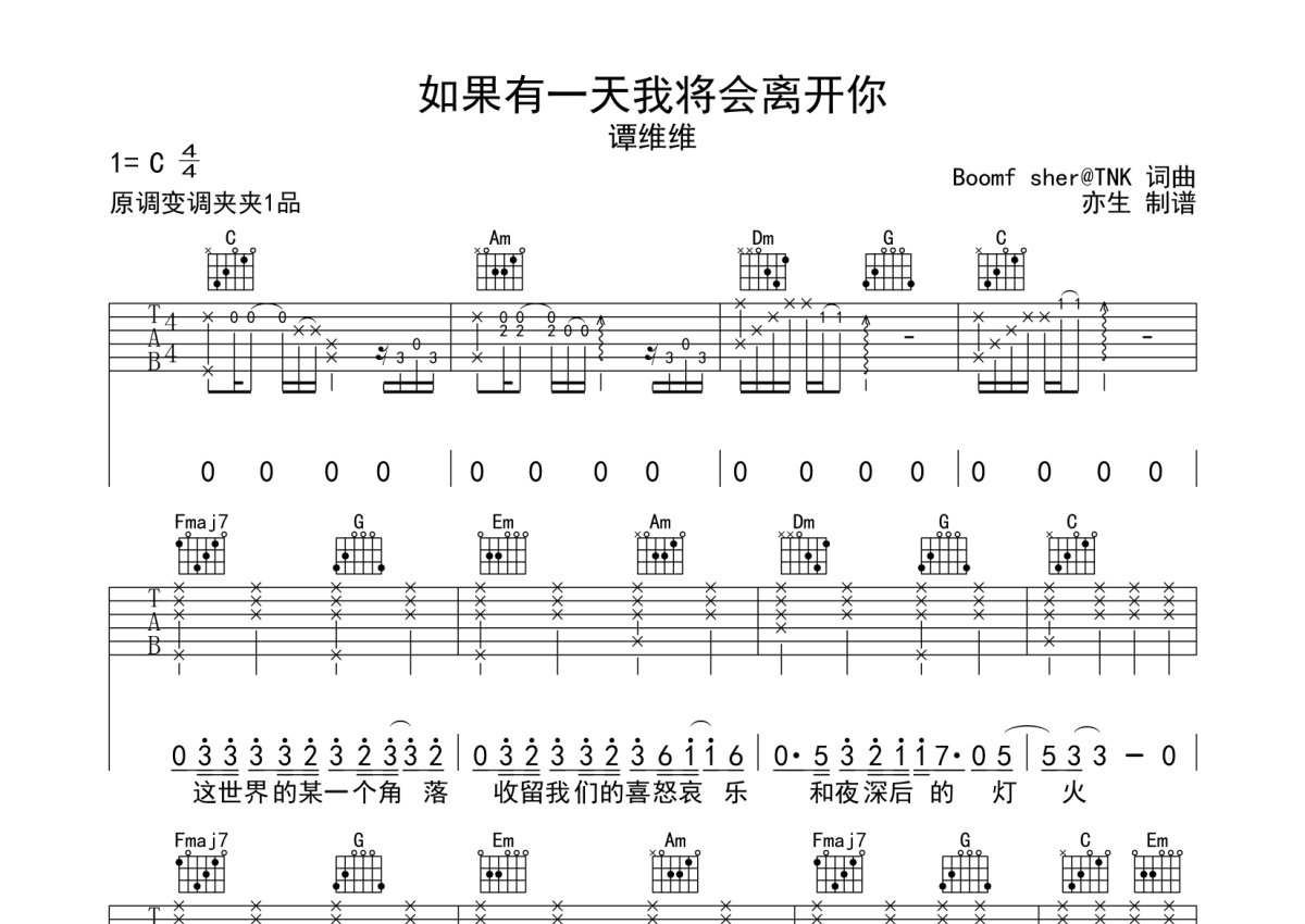 谭维维《如果有一天我将会离开你》吉他谱 - C调弹唱六线谱