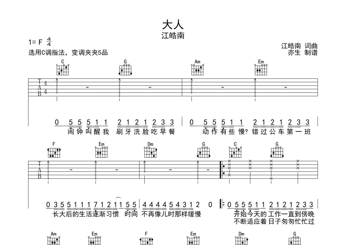 江皓南《大人》吉他谱 - C调弹唱六线谱