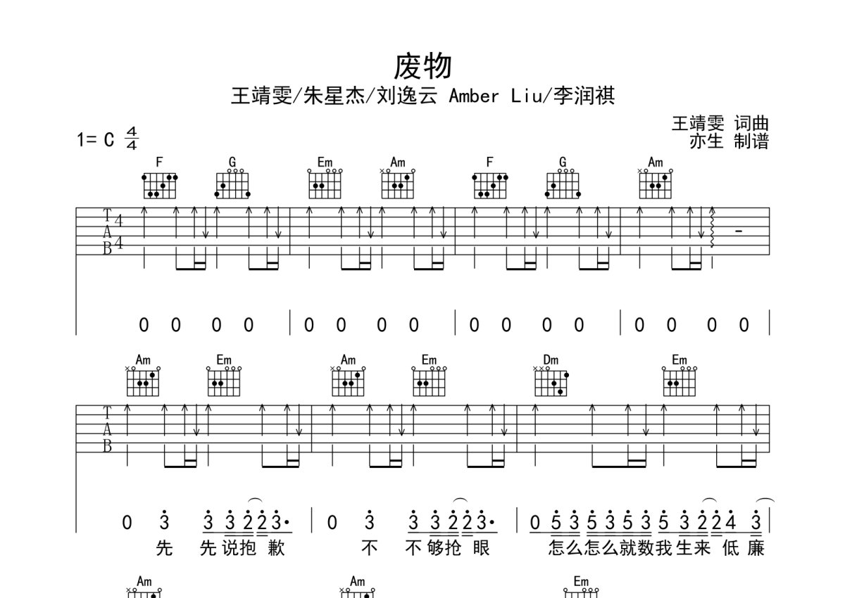 王靖雯《废物》吉他谱 - C调弹唱六线谱 - 扫弦版