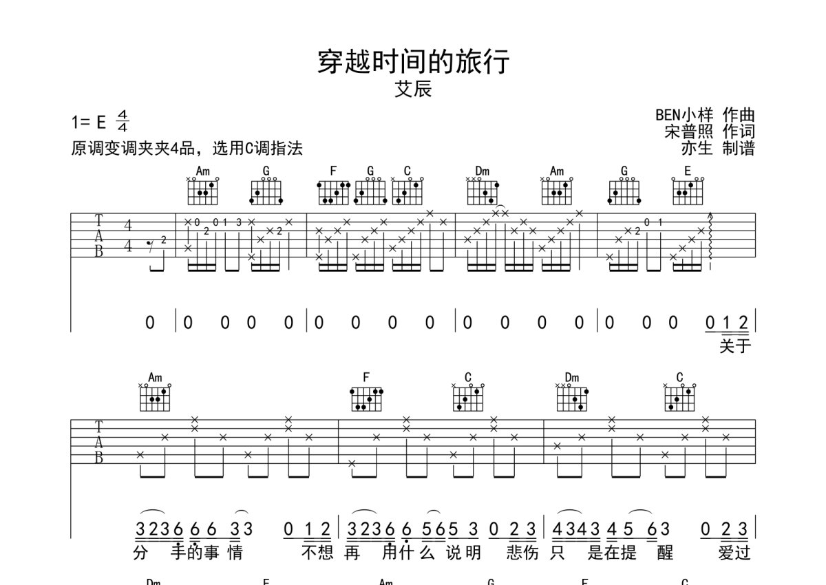 艾辰《穿越时间的旅行》吉他谱 - C调弹唱六线谱