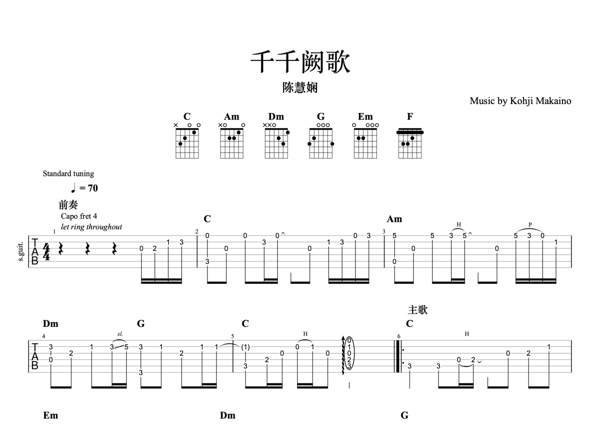 陈慧娴《千千阙歌》吉他谱 - C调独奏六线谱 - 完整编配版