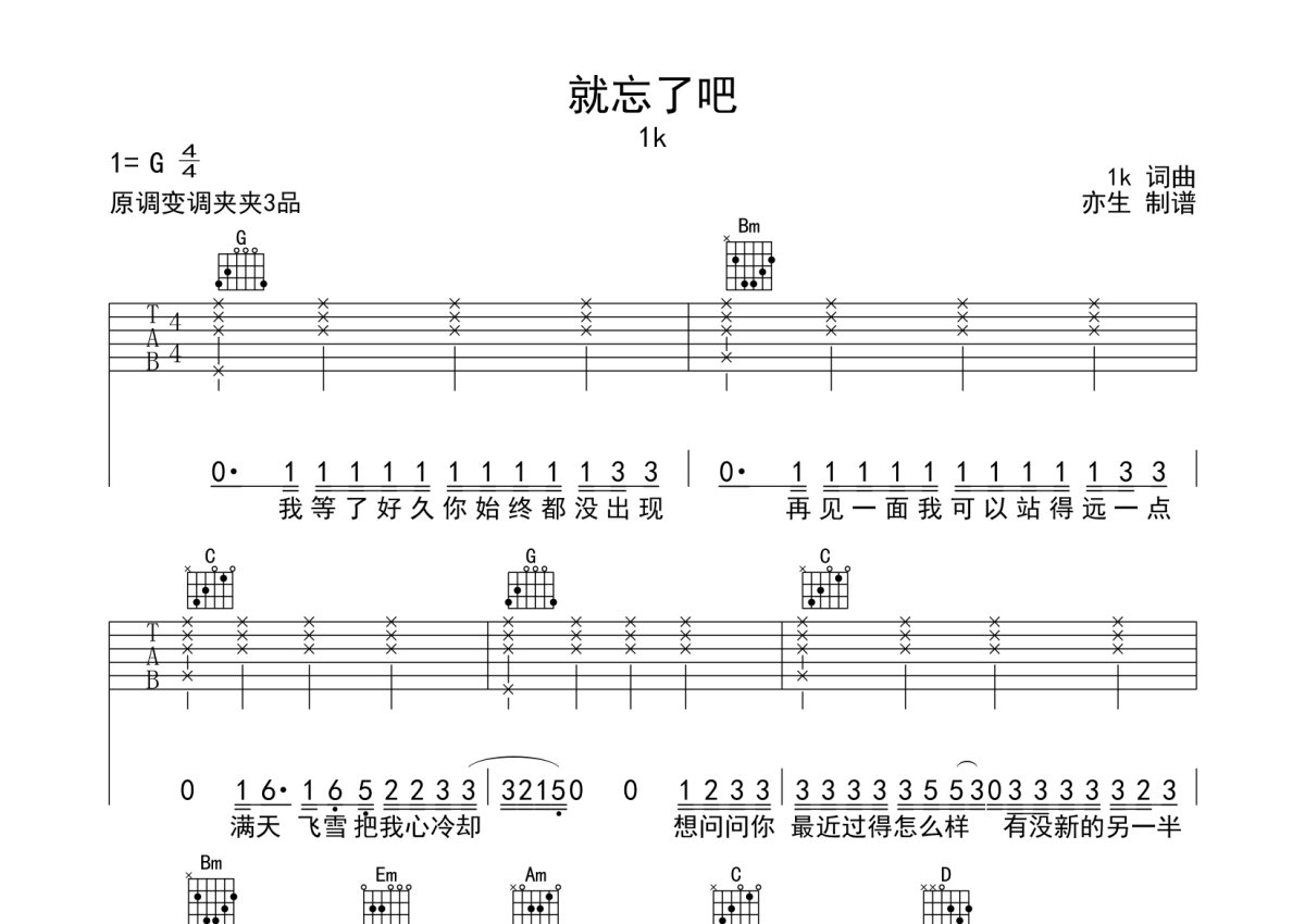 1k《就忘了吧》吉他谱 - G调弹唱六线谱