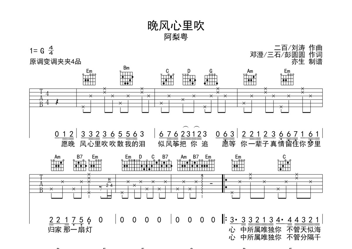 阿梨粤《晚风心里吹》吉他谱 - G调弹唱六线谱
