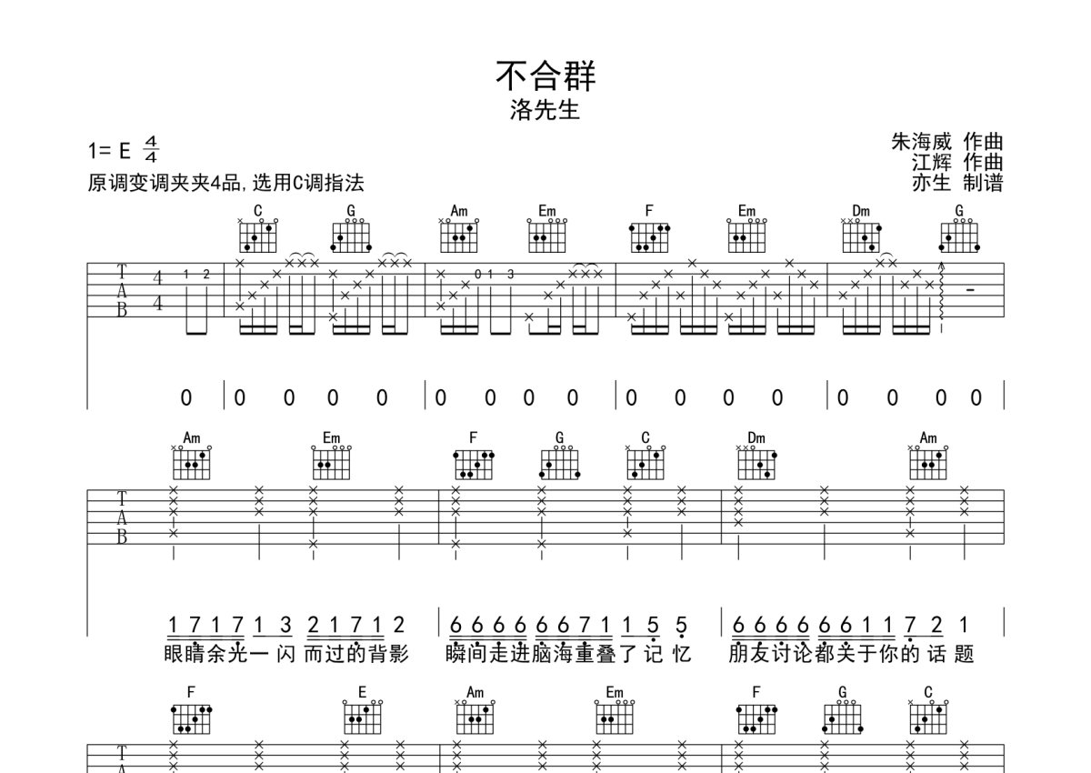 洛先生《不合群》吉他谱 - C调弹唱六线谱