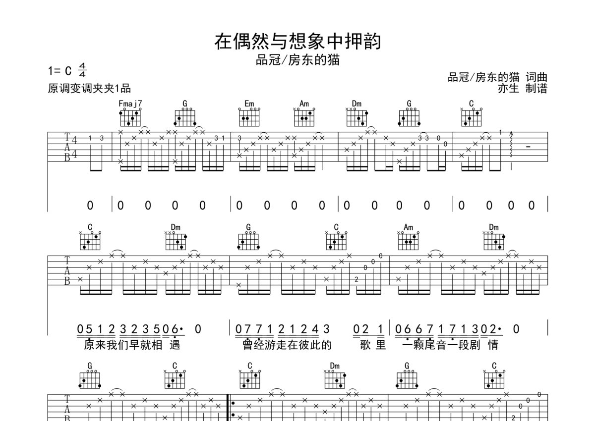 品冠《在偶然与想象中押韵》吉他谱 - C调弹唱六线谱