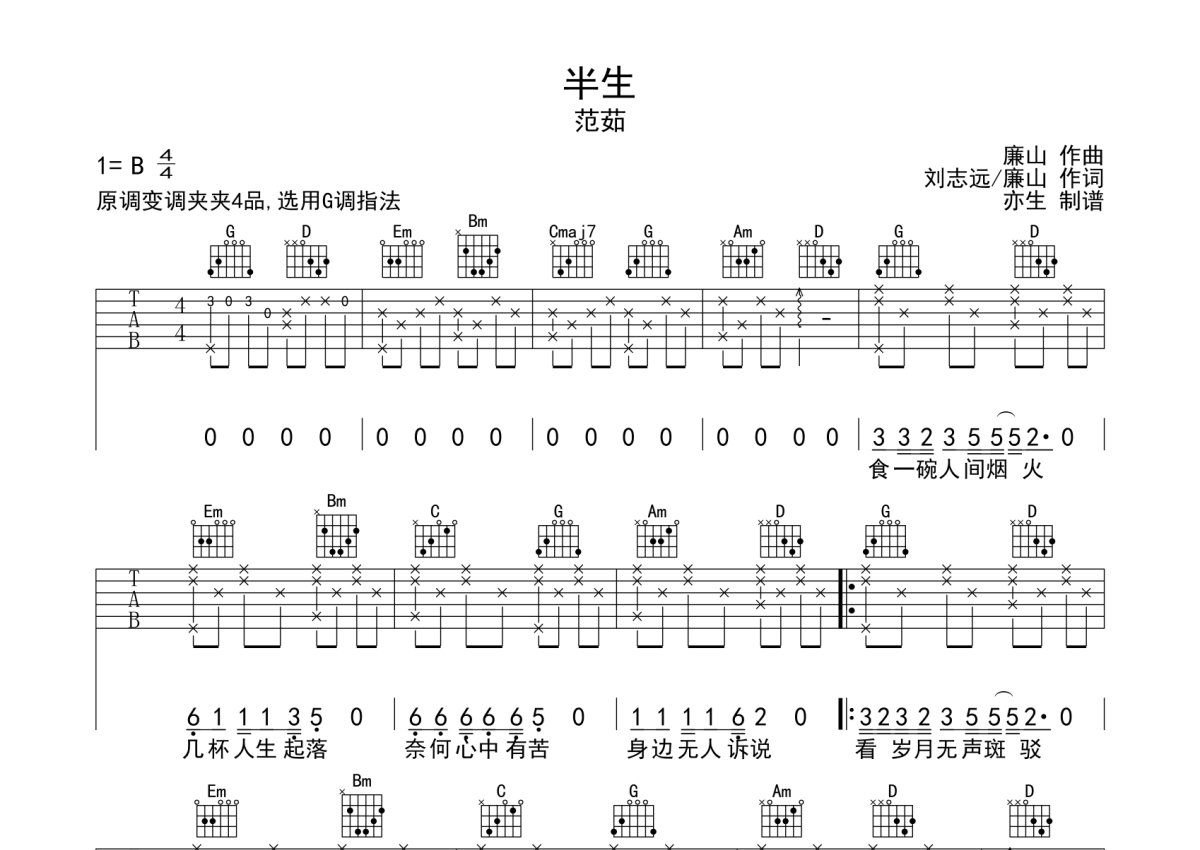 范茹《半生》吉他谱 - G调弹唱六线谱