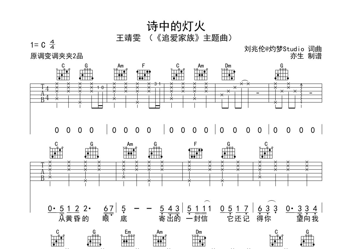 王靖雯《诗中的灯火》吉他谱 - C调弹唱六线谱