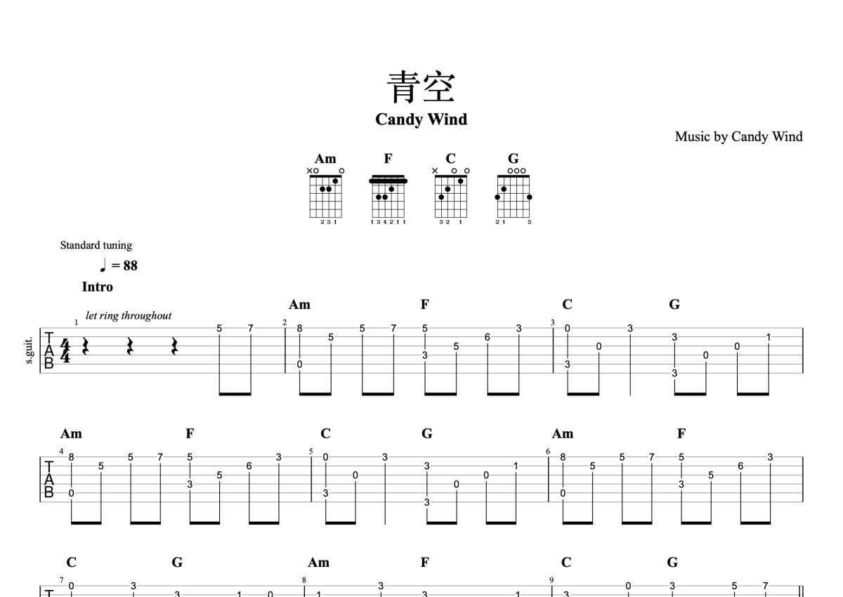 Candy Wind《青空》吉他谱 - C调独奏六线谱 - 完整编配版