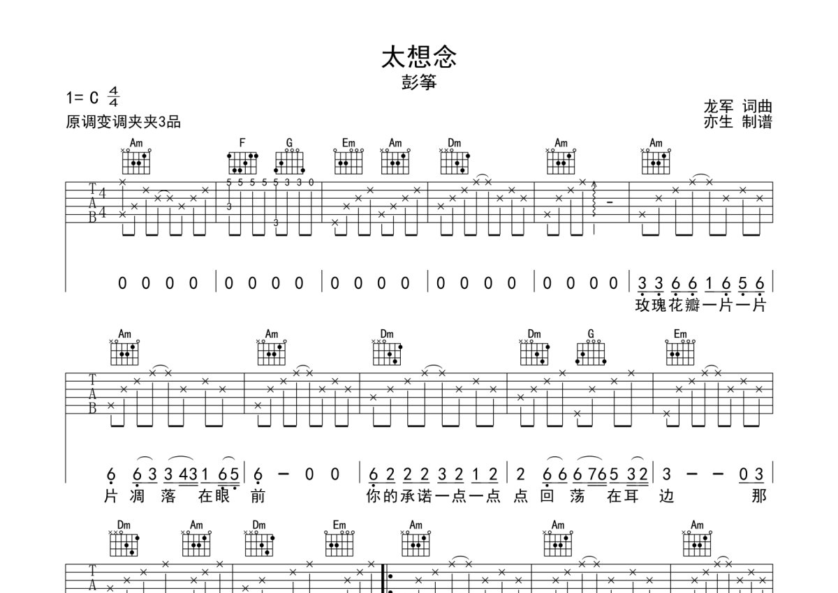 《太想念》是彭筝演唱的一首歌曲,本吉他谱采用的是C调指法编配,这份吉他谱共有两张高清图谱,图谱由 @亦生 编配上传,图谱使用六线谱编配,包含吉他和弦指法、简谱以及歌词部分,使用这份太想念吉他谱,可以让你更加方便地掌握这首歌曲的弹唱技巧,快来尝试吧。本吉他谱采用C调指法编配,节奏4/4拍,变调夹夹第3品演奏,演奏的速度控制在每分钟95拍左右,指法难度简单。