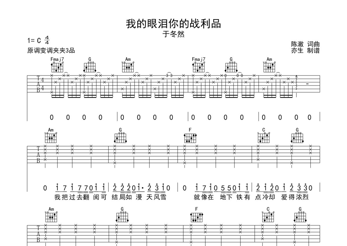 于冬然《我的眼泪你的战利品》吉他谱 - C调弹唱六线谱