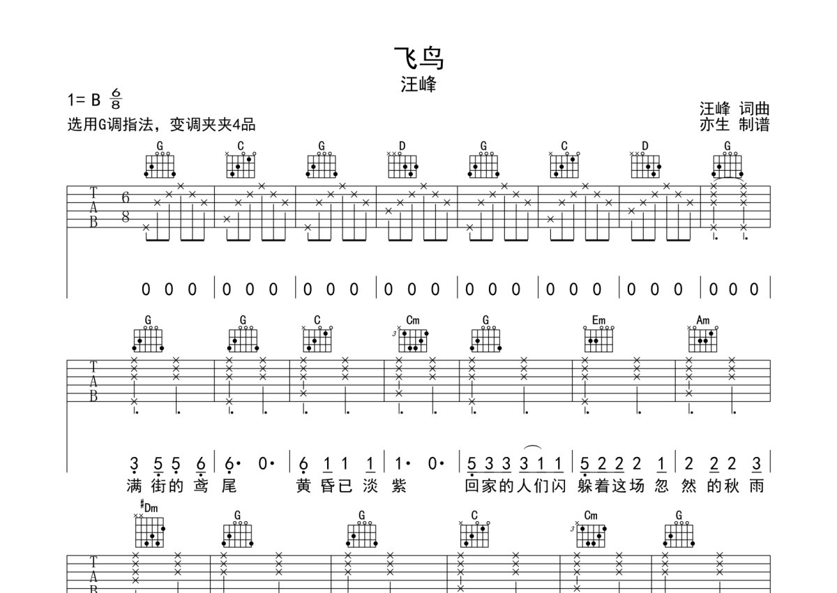 汪峰《飞鸟》吉他谱 - G调弹唱六线谱
