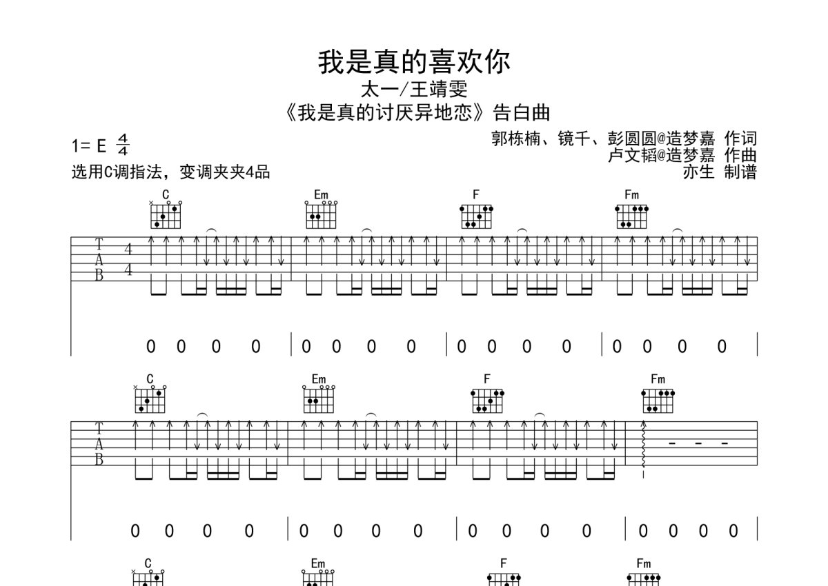 《我是真的喜欢你》是王靖雯演唱的一首歌曲,扫弦版,本吉他谱采用的是C调指法编配,这份吉他谱共有三张高清图谱,图谱由 @亦生 编配上传,图谱使用六线谱编配,包含吉他和弦指法、简谱以及歌词部分,使用这份我是真的喜欢你吉他谱,可以让你更加方便地掌握这首歌曲的弹唱技巧,快来尝试吧。本吉他谱采用C调指法编配,节奏4/4拍,变调夹夹第4品演奏,演奏的速度控制在每分钟95拍左右,指法难度简单。