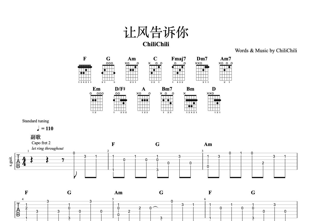 ChiliChili《让风告诉你》吉他谱 - C调独奏六线谱 - 完整编配版