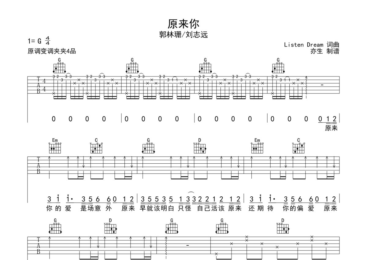《原来你》是郭林珊演唱的一首歌曲,本吉他谱采用的是G调指法编配,这份吉他谱共有三张高清图谱,图谱由 @亦生 编配上传,图谱使用六线谱编配,包含吉他和弦指法、简谱以及歌词部分,使用这份原来你吉他谱,可以让你更加方便地掌握这首歌曲的弹唱技巧,快来尝试吧。本吉他谱采用G调指法编配,节奏4/4拍,变调夹夹第4品演奏,演奏的速度控制在每分钟95拍左右,演奏难度简单。