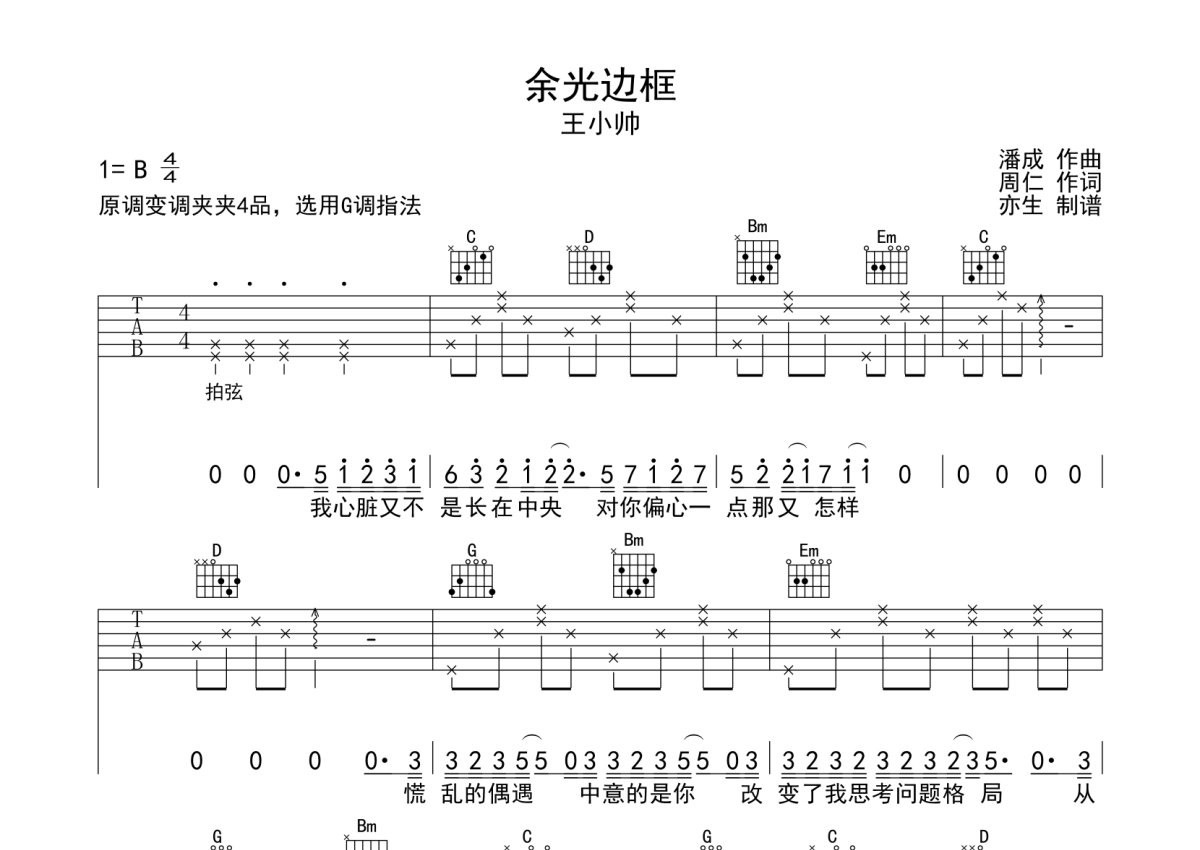 王小帅《余光边框》吉他谱 - G调弹唱六线谱