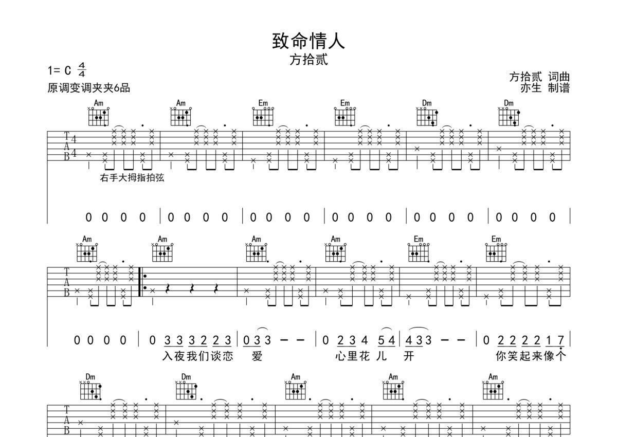 方拾贰《致命情人》吉他谱 - C调弹唱六线谱