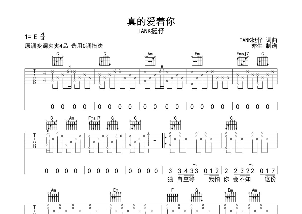 TANK挺仔《真的爱着你》吉他谱 - C调弹唱六线谱