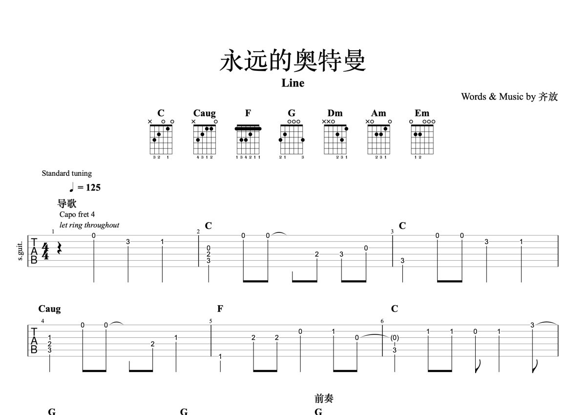 《永远的奥特曼》是Line演唱的一首歌曲,完整编配版,本吉他谱采用的是C调指法编配,这份吉他谱共有四张高清图谱,图谱由 @一颗加菲 编配上传,图谱使用六线谱编配,曲谱配备了相关的音频提供试听,使用这份永远的奥特曼吉他谱,可以让你更加方便地掌握这首歌曲的演奏技巧,快来尝试吧。