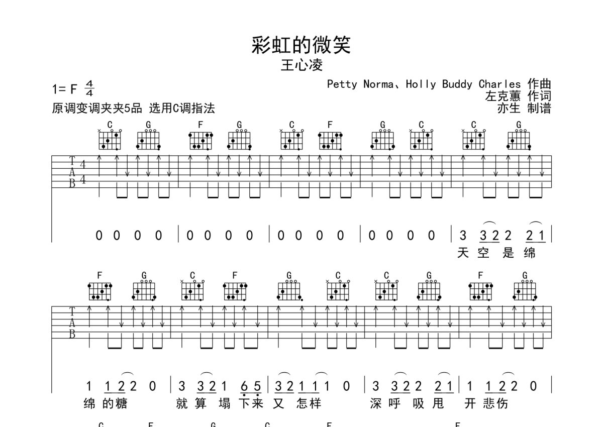 《彩虹的微笑》是王心凌演唱的一首歌曲,扫弦版,本吉他谱采用的是C调指法编配,这份吉他谱共有三张高清图谱,图谱由 @亦生 编配上传,图谱使用六线谱编配,包含吉他和弦指法、简谱以及歌词部分,使用这份彩虹的微笑吉他谱,可以让你更加方便地掌握这首歌曲的弹唱技巧,快来尝试吧。本吉他谱采用C调指法编配,节奏4/4拍,扫弦版,变调夹夹第5品演奏,演奏的速度控制在每分钟100拍左右,演奏难度简单。
