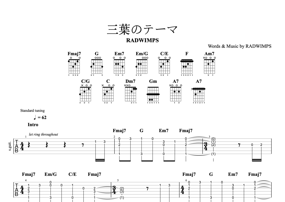 《三葉のテーマ(三叶的主题曲)》是Radwimps演唱的一首歌曲,完整编配版,本吉他谱采用的是C调指法编配,这份吉他谱共有四张高清图谱,图谱由 @一颗加菲 编配上传,图谱使用六线谱编配,曲谱配备了相关的音频提供试听,使用这份三葉のテーマ(三叶的主题曲)吉他谱,可以让你更加方便地掌握这首歌曲的演奏技巧,快来尝试吧。