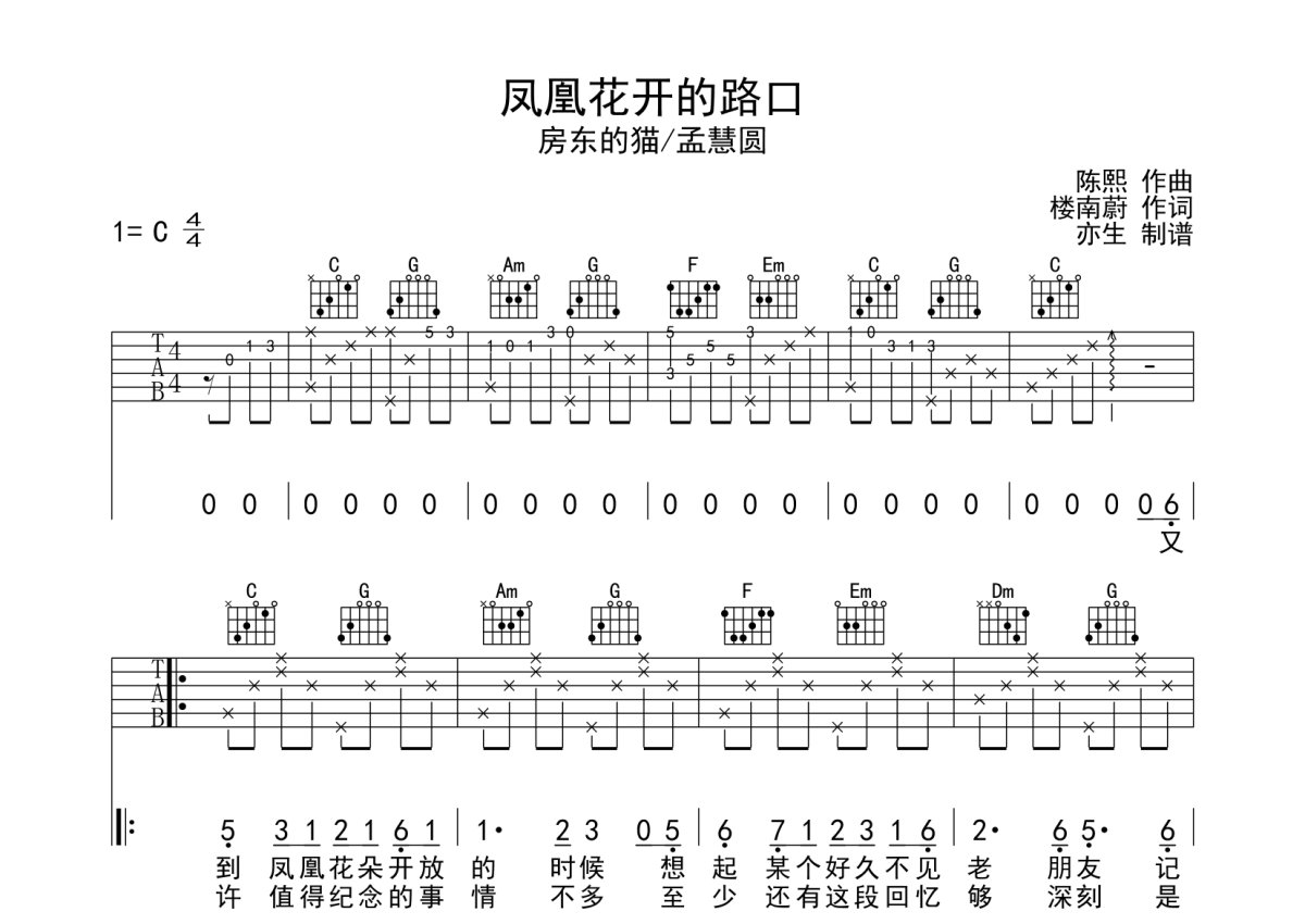房东的猫《凤凰花开的路口》吉他谱 - C调弹唱六线谱