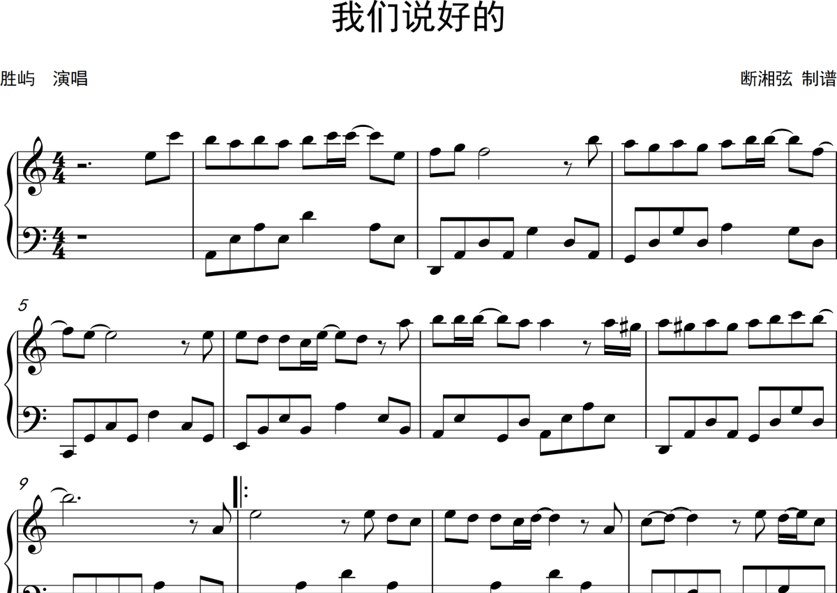 《我们说好的》是胜屿演唱的一首歌曲,这份钢琴谱共有四张高清图谱,图谱由 @月隐云先知 编配上传,曲谱配备了相关的音频提供试听,使用这份我们说好的钢琴谱,可以让你更加方便地掌握这首歌曲的演奏技巧,快来尝试吧。胜屿《我们说好的》钢琴谱。