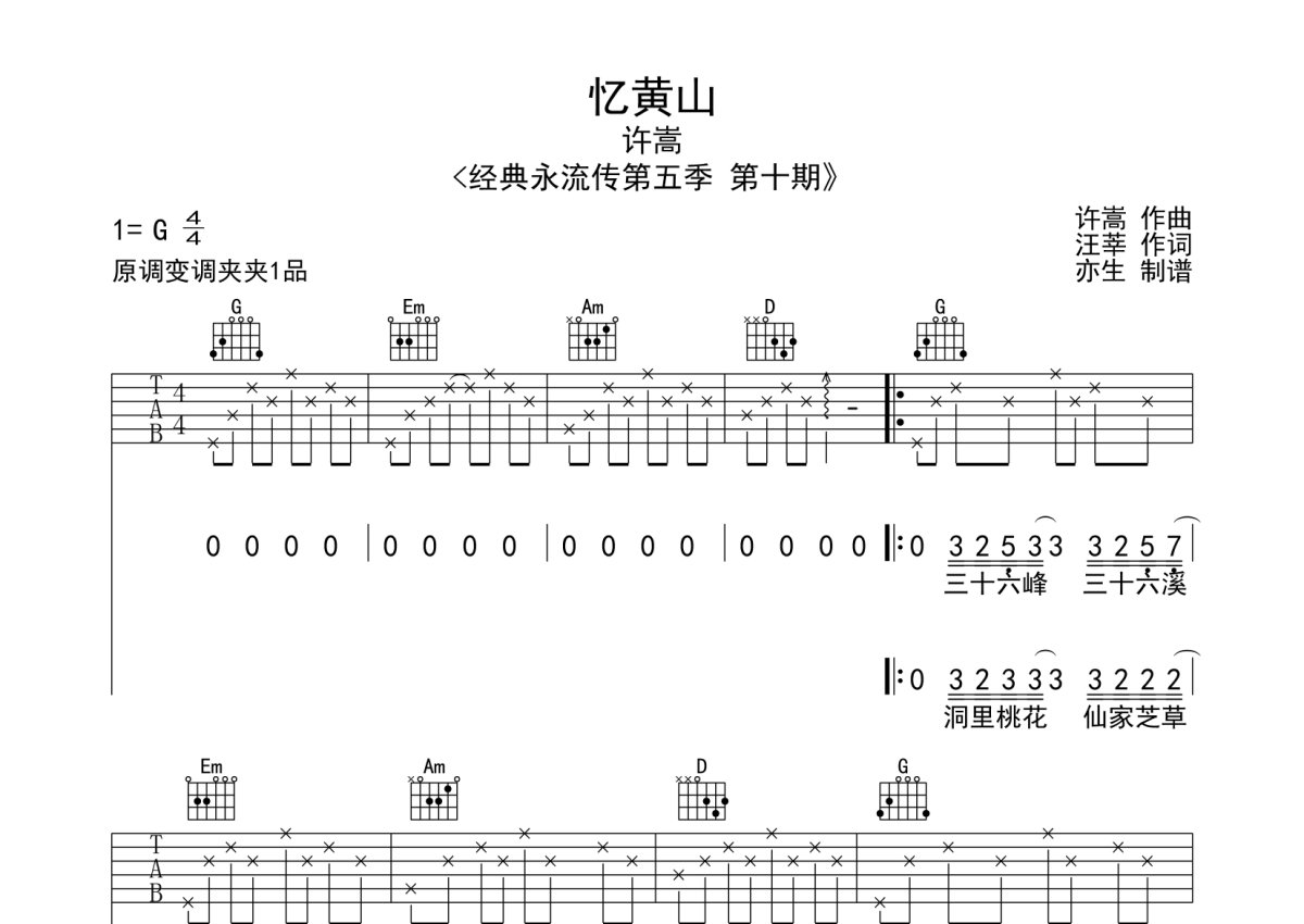 许嵩《忆黄山》吉他谱 - G调弹唱六线谱