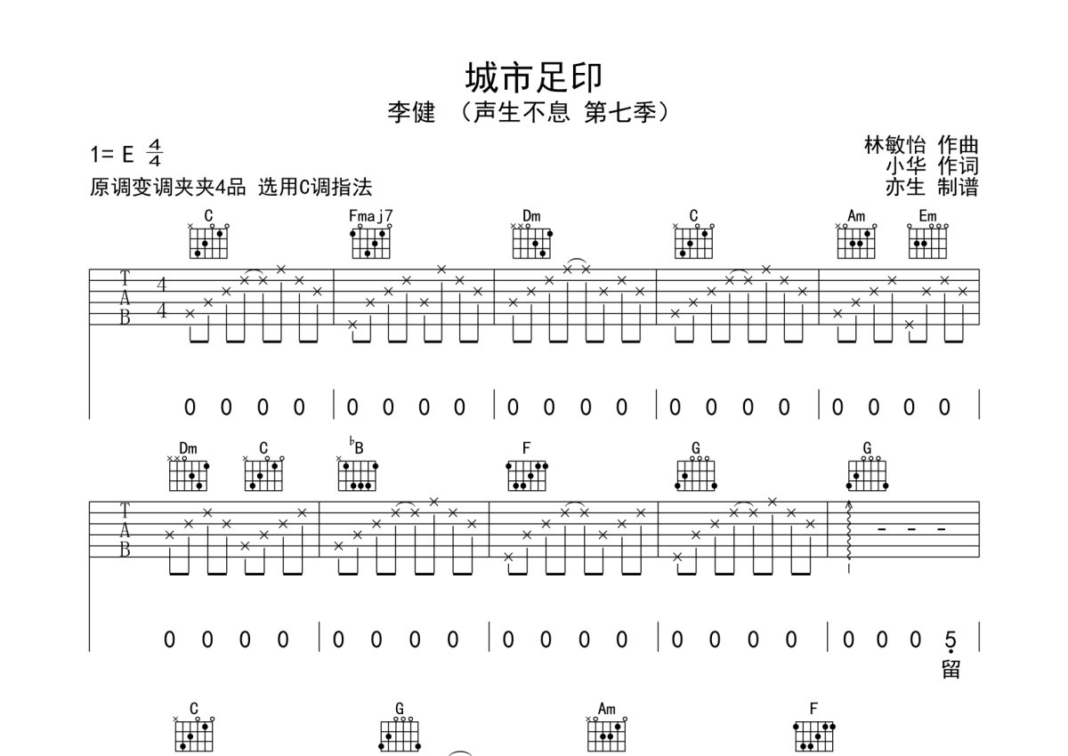 李健《城市足印》吉他谱 - C调弹唱六线谱