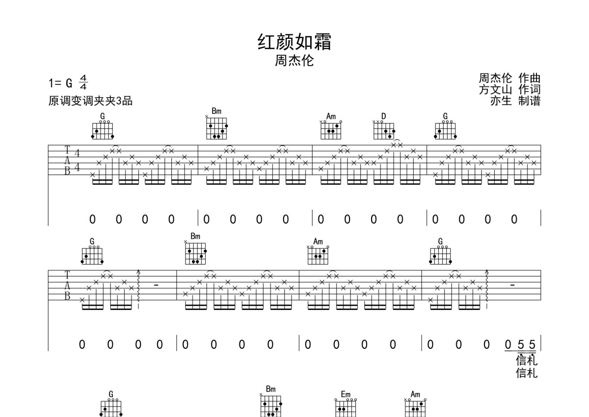 周杰伦《红颜如霜》吉他谱 - G调弹唱六线谱