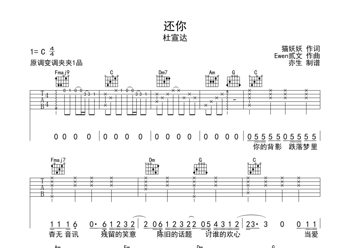 杜宣达《还你》吉他谱 - C调弹唱六线谱