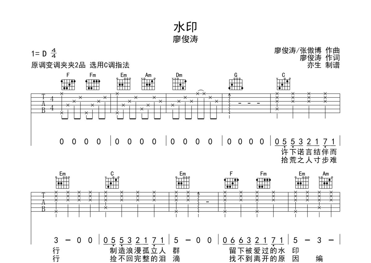 廖俊涛《水印》吉他谱 - C调弹唱六线谱
