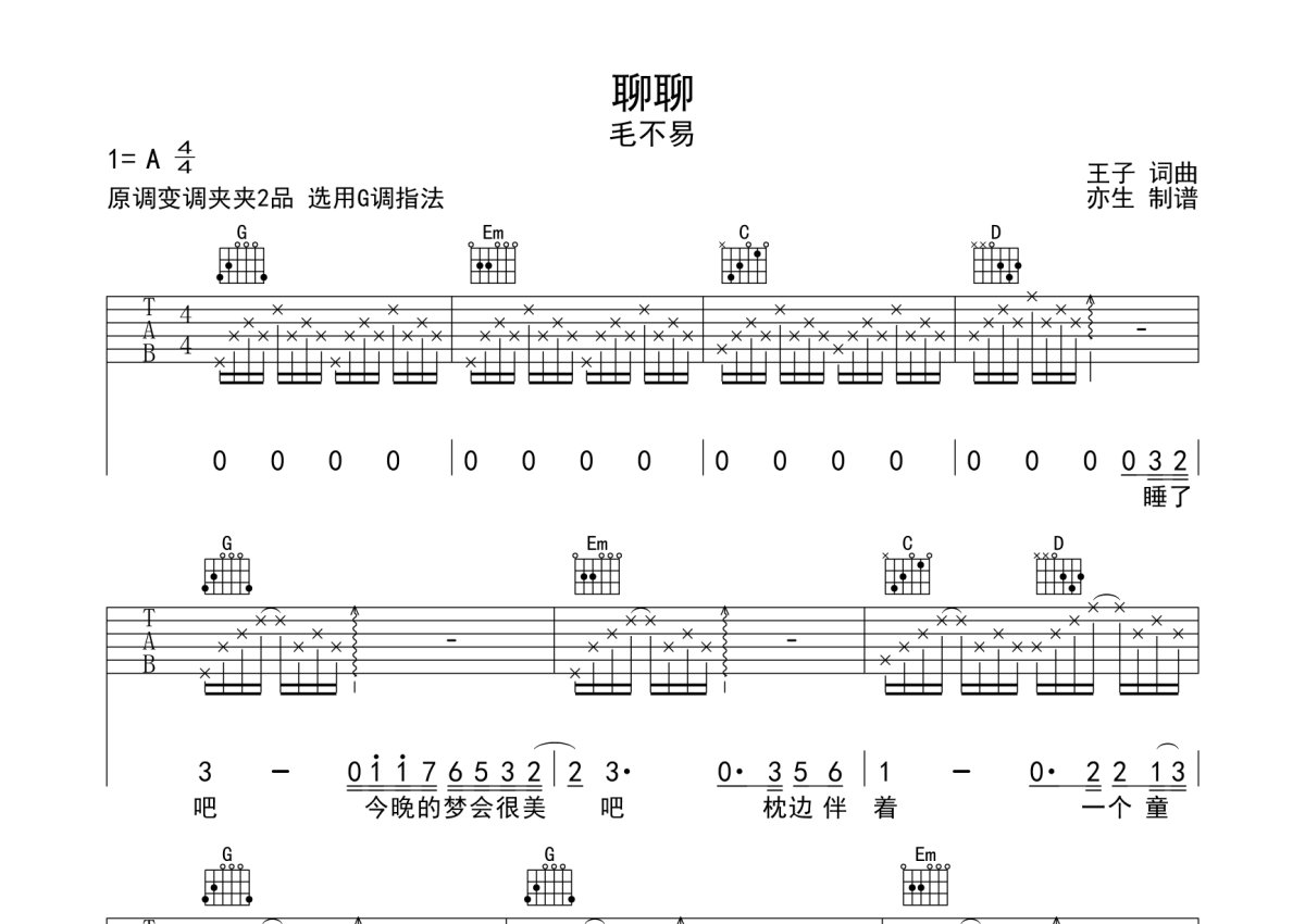 毛不易《聊聊》吉他谱 - G调弹唱六线谱